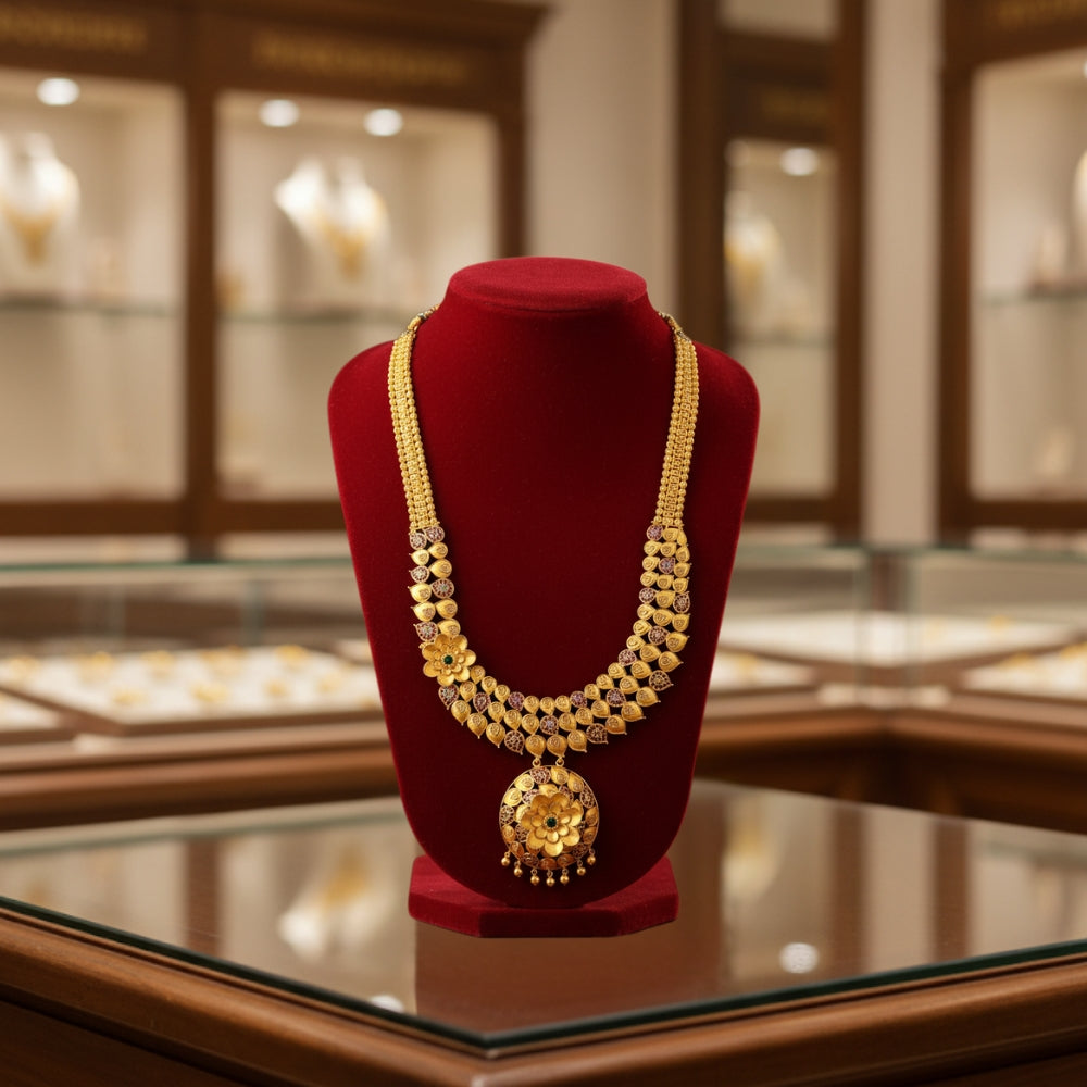This elegant Floral Leaf Motif Haram is crafted in pure gold, featuring beautifully detailed floral and leaf patterns linked gracefully along the chain. The pendant showcases intricate craftsmanship with a traditional paisley-inspired design, enhanced with delicate detailing that adds charm and sophistication. Perfect for weddings, festive occasions, and cultural celebrations, this haram combines natural beauty with timeless tradition, making it a treasured heirloom.